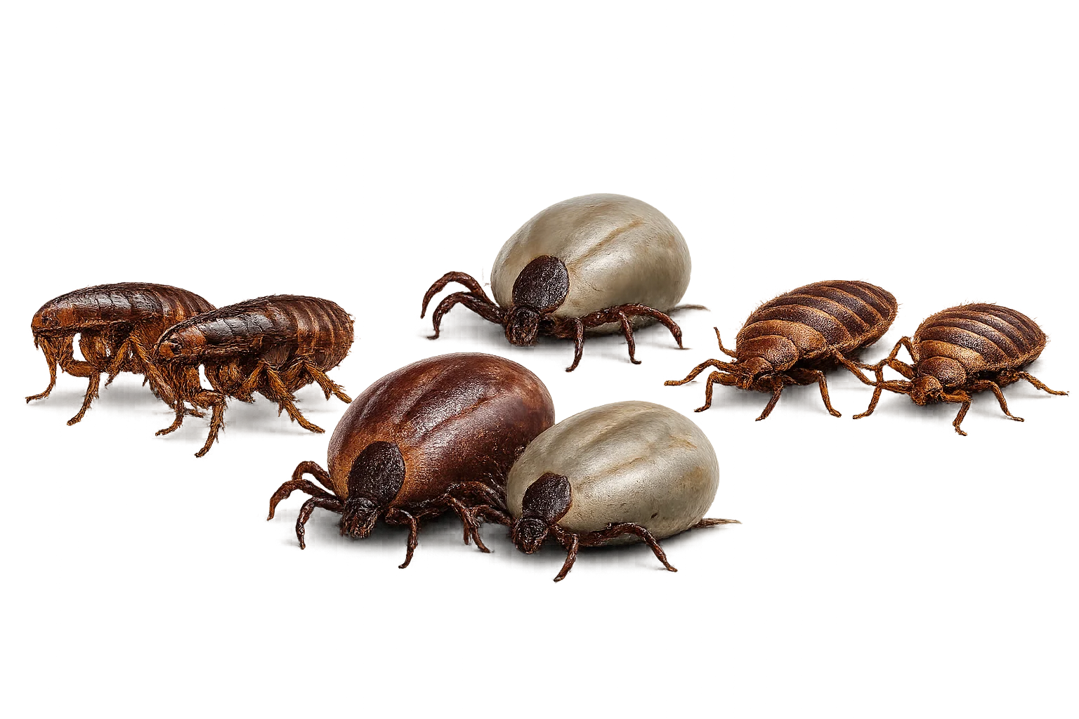 Baratas, formigas, aranhas, pulgas e percevejos.